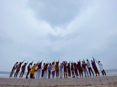 活动的第二站,大家来到东疆亲海公园,让很多从未见过大海的同学们亲眼感受了大海的波澜壮阔。参观时恰逢涨潮,伴随着阵阵海风,海面波涛翻滚,海天一色,在场同学无不被壮阔的海景所震撼,都发自内心地露出了灿烂的笑容。