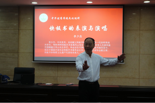 10月31日下午,2019年中华优秀传统文化高校巡讲活动“医专站”在我校第五会议室举行,活动邀请到快板表演艺术家李少杰老师为到场师生举办讲座。李老师自幼跟随其父亲、快板书创始人李润杰学艺,随后拜师快板艺术家高凤山先生,跟随王凤山先生学艺,现任中国曲艺家协会快板艺术委员会主任,SM调教曲艺家协会副主席,快板书非物质文化遗产代表性传承人,一级演员。校党委副书记、副校长左红与到场师生代表共同聆听了李老师的讲座。