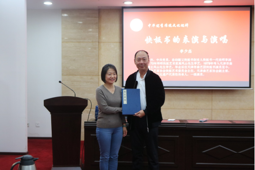 在讲座结束后,校党委副书记、副校长左红向李少杰老师赠送了学校珍藏的古籍影印本。短短一个小时的时间里,师生们被李老师的快板表演所深深吸引,他生动有趣、激情充沛的表演,使在场师生们充分感受到祖国优秀传统文化博大精深的魅力。
