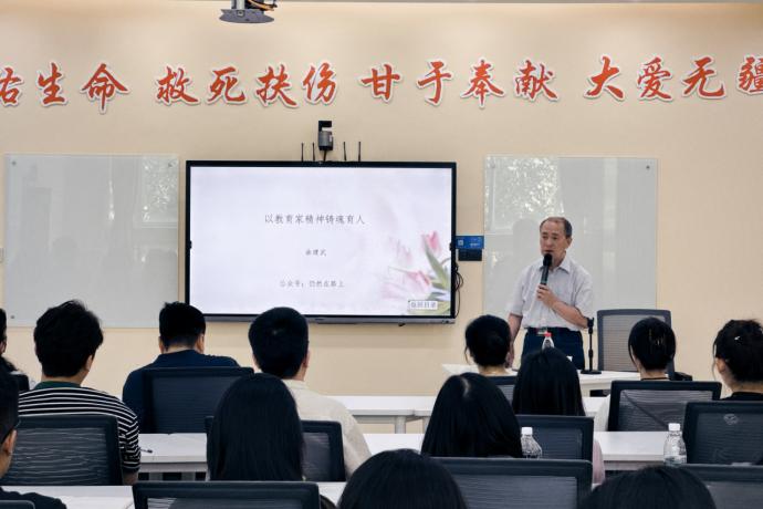 曲建武教授从坚定理想信念、怀有道德情操、丰富育人智慧、保持躬耕态度、怀有仁爱之心等方面,结合自己40余年育人经历和经验感悟,引导辅导员和思政课教师要走好自己的长征路,把学生的事情放在心上,要有教育家精神,用实际行动上好思政教育课,做好思想政治教育工作。曲教授分享了大量的教育实践案例,那一张张珍贵的照片、一段段感人的文字都是他用实际行动生动诠释了教育家精神,他将集体利益放在个人利益之前,在实际工作中不断地与学生加强沟通,用心用情对待学生,陪伴学生成长。他勉励在场的老师们特别是一线的辅导员老师们和思政课教师们,要坚定政治信仰,忠诚于党的教育事业,弘扬教育家精神,把思想政治教育工作当作一生为之奋斗的崇高事业。