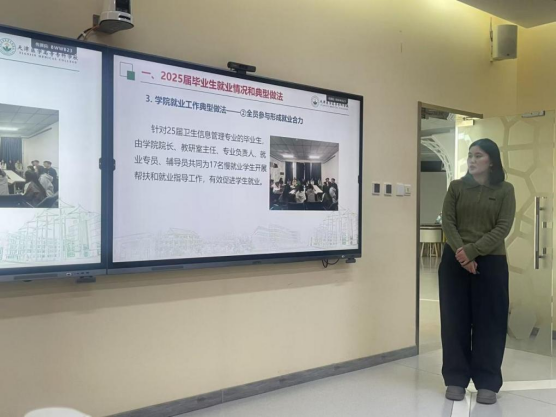 在经验交流环节,卫生健康管理学院和医学技术学院分别结合本学院的就业工作特色,分享了各自学院的工作经验及典型做法,并对2026届毕业生就业工作提出了具体规划和举措。