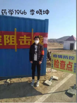 药学1946李晓坤同学也积极参与,为抗击疫情贡献自己的力量,他检查出入人员是否佩戴口罩,防止外来人员进去村中。他说,“希望疫情尽快散去,祖国无恙,你我无恙,人间充满爱与希望。”