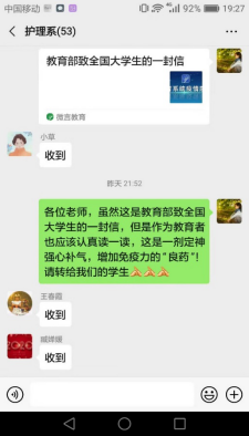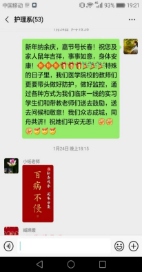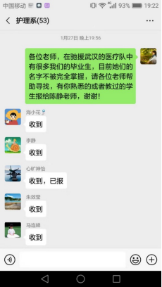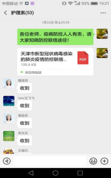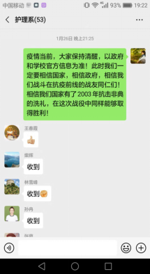 护理系多渠道加强有关疫情防控政策解读工作,确保信息渠道畅通。通过微信群、qq群等网络渠道积极开展宣传教育,普及疫情防治知识和防控要求,引导师生和家长做好自我防护。自1月22日开始,“护理系群”开始不断关注和转发疫情信息实时动态。不管是任课老师还是辅导员,都在这个群中分享着防控疫情的新消息。大家一方面做好不信谣、不传谣的宣传,另一方面为有需要的人提供必要的心理和物质援助。老师们及时关注、沟通着驰援武汉毕业生的消息,防控感染,抗击疫情,牵动着每一个护理系人的心。