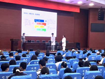 项琳老师从礼仪的基本概念入手,强调礼仪在人际交往和职业发展中的重要性。她指出,礼仪不仅是外在的行为表现,更是内在修养的体现,能够帮助实习生在职场中赢得他人的尊重与信任。在个人形象礼仪方面,项老师详细讲解了着装规范、仪容仪表要求等,示范了医护人员在工作中的站姿、坐姿、走姿,以及在为患者提供服务时的指引手势,并针对学生们的现场模仿进行纠正,让学生们直观地了解到如何根据实习岗位的性质选择合适的服装。在演讲的最后,项教授通过两个小游戏,教会大家从不同的角度看待问题,得到的结论也不一样,让我们学会辩证看待问题。