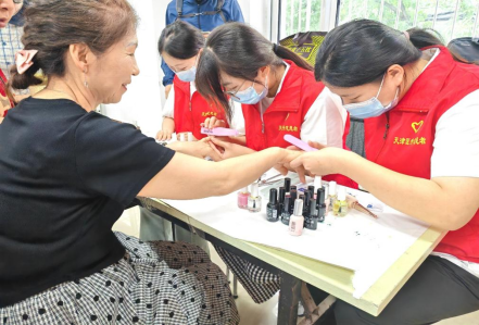 医学美容技术与美容美体艺术专业的师生为社区居民带来了别开生面的“爱心美甲”服务。她们一边为居民修剪指甲、涂抹甲油,一边讲解手部护理知识,让居民在享受美丽服务的同时,也学到了实用的健康知识。活动现场气氛温馨融洽,居民们对学生们娴熟的技艺和热情的服务赞不绝口。一位阿姨笑着说:“没想到还能在社区里享受到这么专业的美甲服务,这些孩子们真棒!”