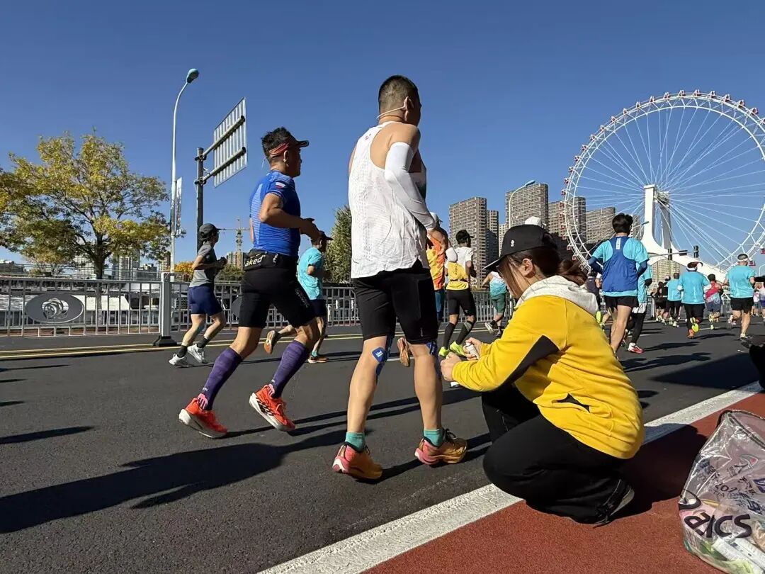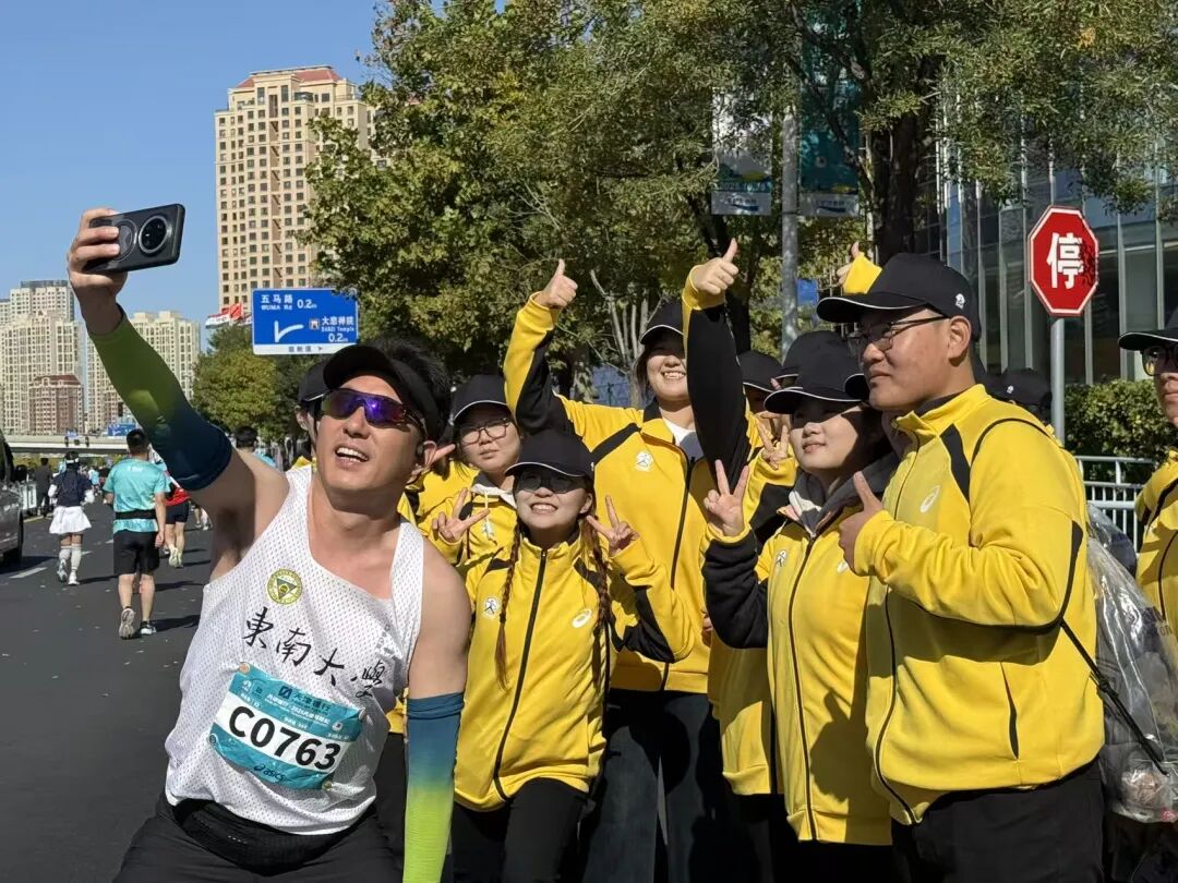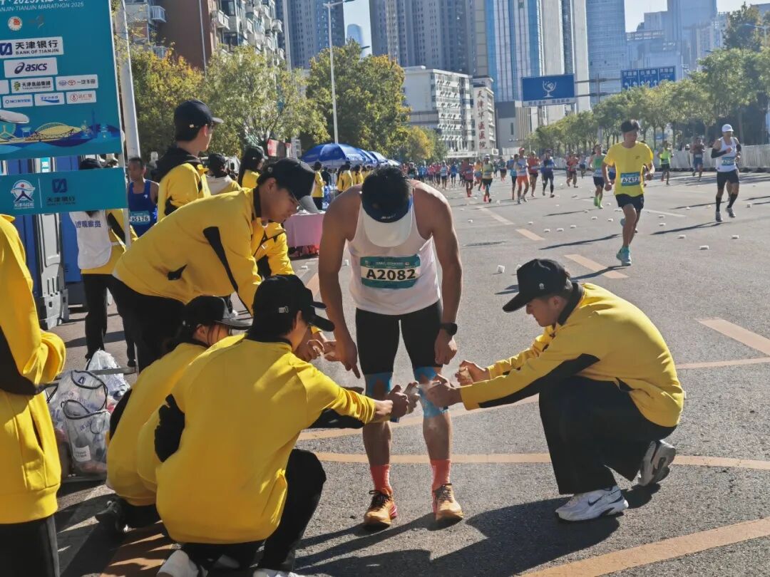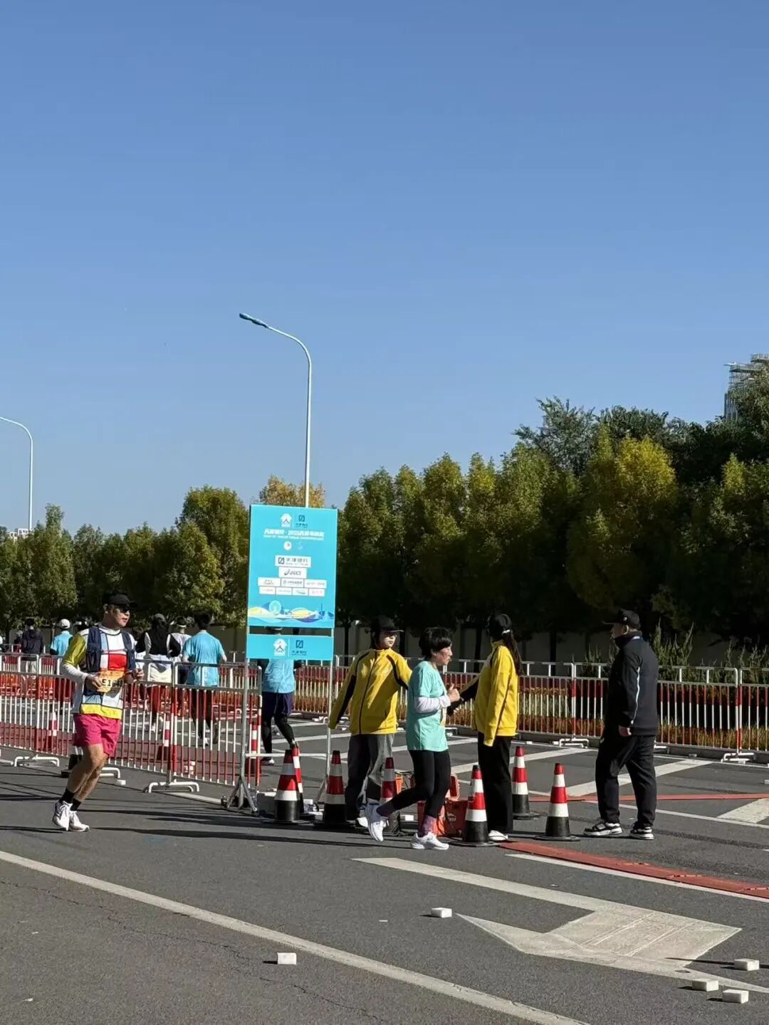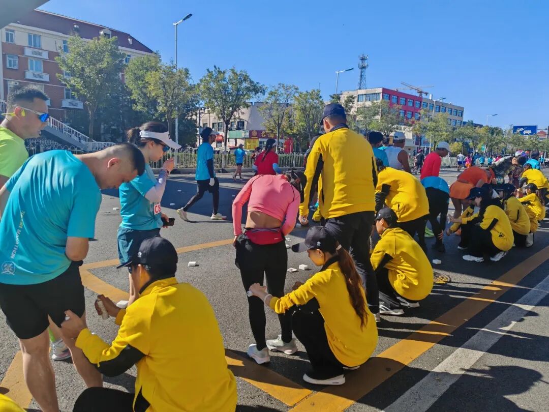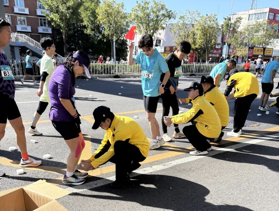 比赛当天凌晨五点,志愿者们准时集结,整装待发,奔赴赛道 5 公里至 40 公里沿线 15 个关键区段。在赛道沿线,他们以饱满的精神风貌为选手加油助威,时刻关注跑者的身体状态与运动表现,以温暖笑容传递鼓励,以扎实技能守护健康。他们喷出缓解肌肉酸痛的药水,递出补给盐水,无论是及时处理肌肉抽筋,还是给予科学指导与暖心鼓励,均彰显出医专学子的专业素养与服务温度。