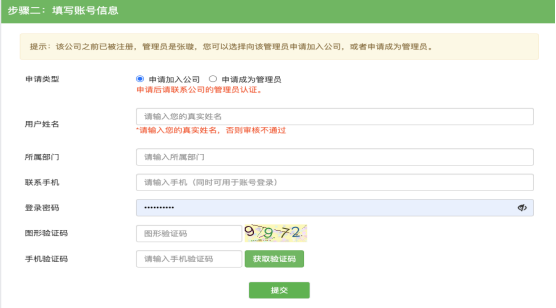 (2)当公司管理员出现更换/离职等情况,您可以申请成为管理员,提交相关证明材料后由平台认证(1~3个工作日内审核完成),认证通过后您可以加入公司并成为公司管理员。