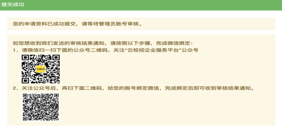 填写完成后点击提交,等待管理员/平台审核通过后即可。若您需要接收审核通知,可根据页面提示关注“云校招企业服务平台”公众号接收消息。