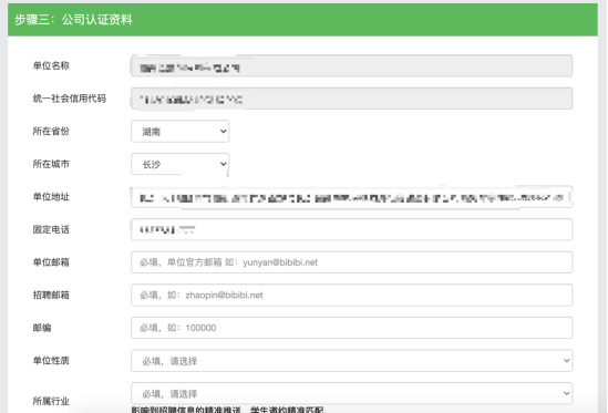 情况二:您的公司未曾注册过快招聘|云校招企业服务平台,则需要填写公司招聘相关的资料并由平台进行审核。平台将在1~3个工作日内审核完成,您可通过账号设置绑定“云校招企业服务平台”接收审核通知。